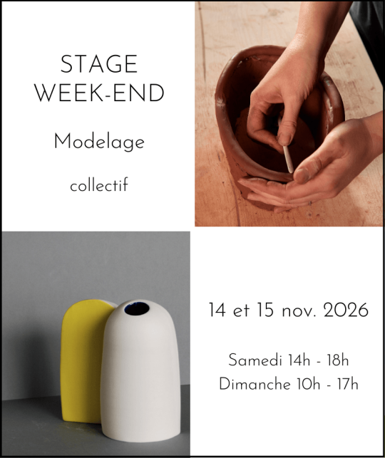 Stage week-end de poterie céramique le samedi 14 novembre 2026 de 14h à 18h et le dimanche 15 novembre de 10h à 17h à Suresnes (Hauts-de-Seine 92). Adultes et adolescents, débutants ou confirmés.
